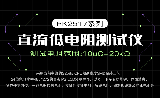 RK2517系列直流電阻測試儀采用當(dāng)前主流的32bits CPU和高密度SMD貼裝工藝、24位色分辨率480*272的真彩IPS LCD液晶屏顯示以及上下左右功能鍵,界面清爽、操作便捷;其使用于繼電器接觸電阻、接插件接插電阻、導(dǎo)線電阻、印制板線路及焊孔電阻等;溫度補(bǔ)償能免除環(huán)境溫度對測試工作的影響;RK2517系列提供了多種接口功能,可方便的與PC進(jìn)行數(shù)據(jù)通訊和遠(yuǎn)程控制。