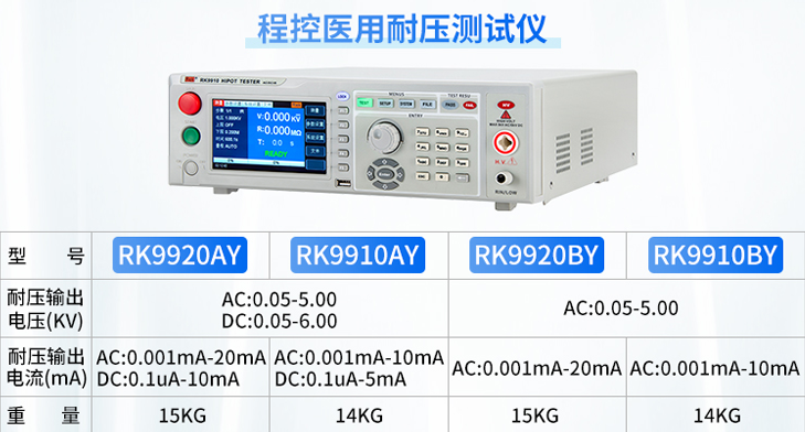 RK2675AM (500VA) . RK2675WM(無源). RK2675B(1000VA).RK2675C(2000VA).RK2675D(3000VA).RK2675E(5000VA)這幾款是目前較為常用的泄漏電流測試儀。